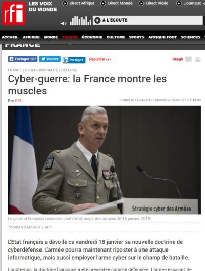 La France n’est évidemment pas en reste et fin janvier dernier, notre pays a dévoilé sa nouvelle doctrine de Cyber-guerre et de Cyber-défense avec le recrutement notamment d’un millier de cyber-combattants supplémentaires.