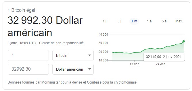 Nous sommes à presque 33 000 dollars lorsque j’écris ces lignes. Il peut aller encore plus haut dans les prochains jours.