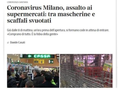 Pour ceux qui ne savent pas trop par quoi commencer, restons simples et pratiques. A Wuhan, cela fait un mois que les Chinois ne peuvent pas sortir des chez eux. Les Italiens ne feront sans doute pas mieux, et nous itou. Alors, restons humbles, et partons du principe prudent que ce qui arrive à nos amis Chinois, peut nous arriver demain, à une vitesse fulgurante d’après ce que l’on voit en Italie. Alors un mois de nourriture d’avance c’est un minimum. 2 mois, c’est nettement mieux, cela vous évitera de courir avec la foule. 3 mois pour ceux qui le peuvent…. et puis un peu de « rab » pour les voisins imprévoyants, car nous devons tout faire pour ne pas renier notre humanité.