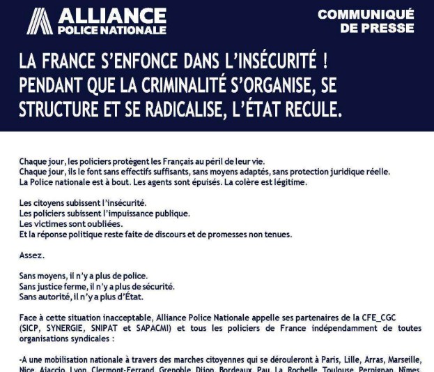 « La Police nationale est à bout et que les agents sont épuisés », pendant que « les citoyens subissent l’insécurité et que les victimes sont oubliées. »