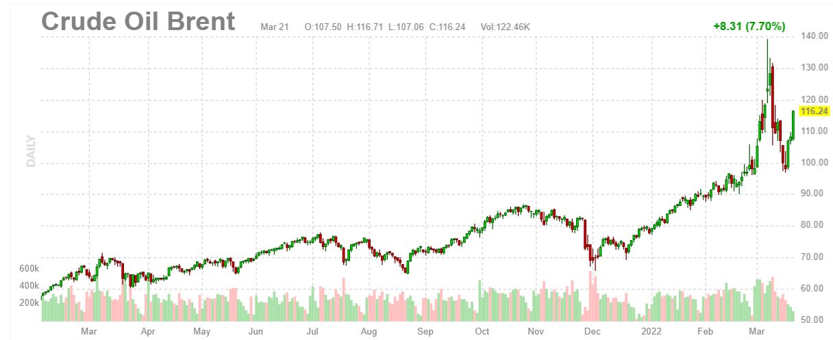 « Les prix du baril de Brent, référence du pétrole en Europe, et de WTI américain ont bondit lundi de plus de 6 %, propulsés par le regain de tensions au Moyen-Orient et des pourparlers de paix en Ukraine dans l’impasse ».