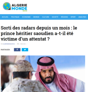 « D’après l’agence iranienne Fars, une tentative d’assassinat aurait eu lieu contre le prince héritier saoudien Mohammed ben Salmane Al Saoud il y a un mois. D’autres médias précisent par contre qu’il s’agirait d’une désinformation et que la rumeur sur son décès a été lancée sur Twitter.