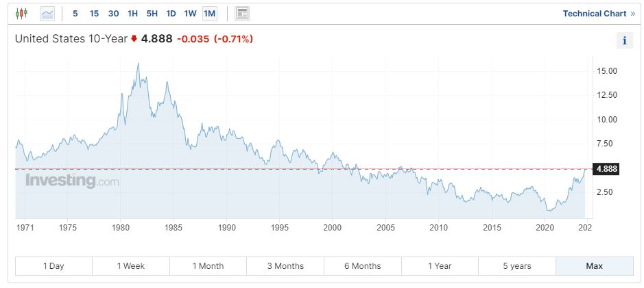 Le rendement des bons du Trésor à 10 ans a atteint 5,018 % hier lundi 23 octobre vers 11h40, poussé notamment par la perspective que la banque centrale américaine maintienne ses taux directeurs élevés pour longtemps, afin de lutter contre l’inflation!