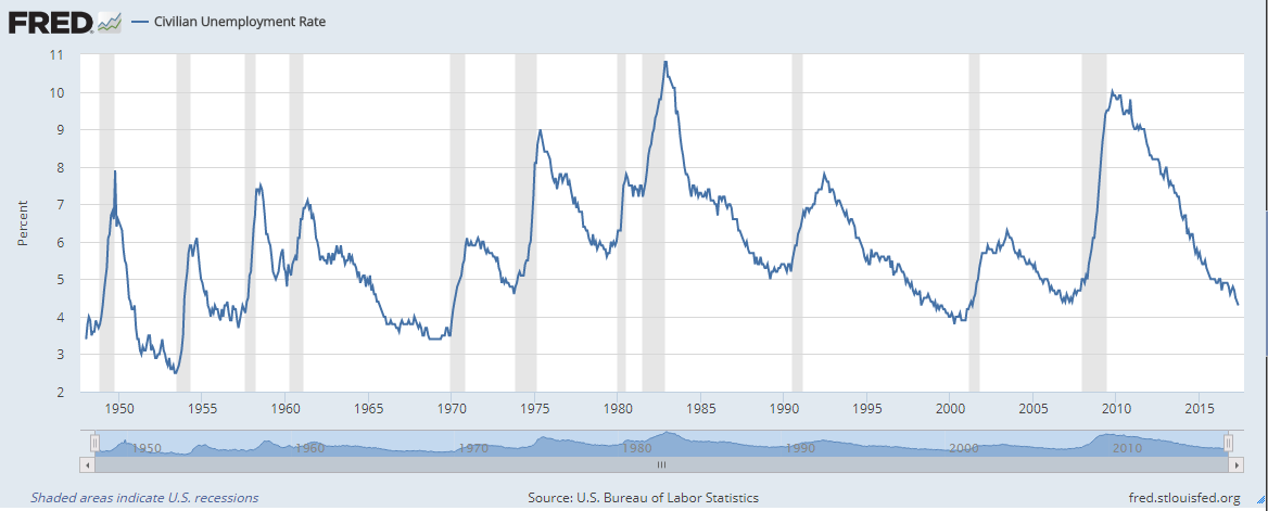 Sur le graphique ci-dessous, le chômage, officiellement, aux USA, va passer de 10 % en 2010 à 4,3 % au mois de mai 2017, soit une baisse de 5,7 points.