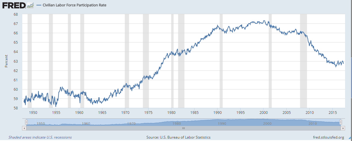 Et ce taux de participation s’effondre. Avant le début de la crise en 2007, plus de 66 % des Américains étaient dans la population active, aujourd’hui ils ne sont plus que 62,7 % en mai 2017, soit une perte de 4 points environ.
