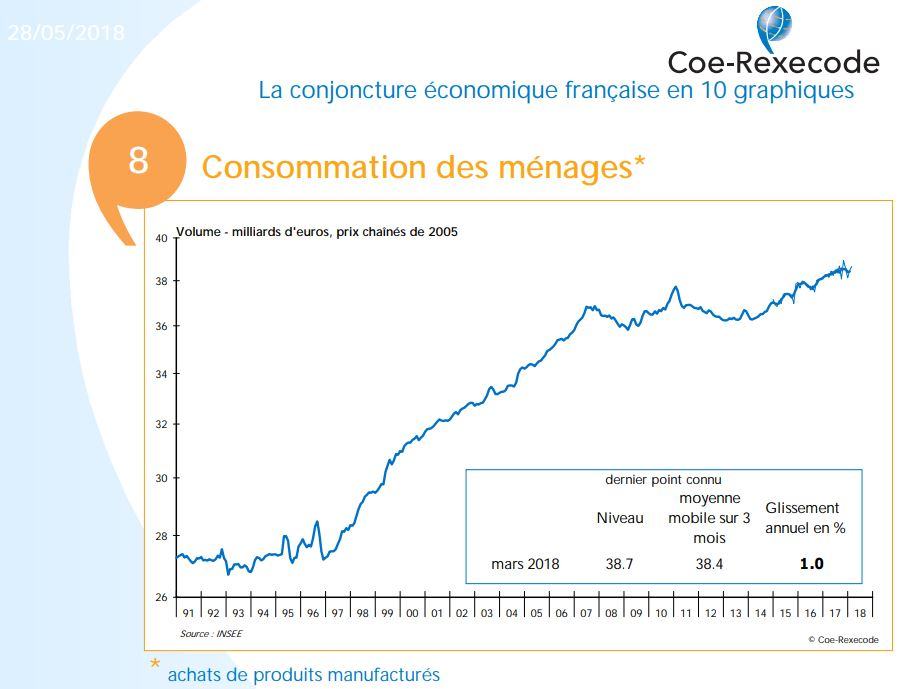 La consommation des ménages en valeur se maintient à des niveaux élevés bien qu’elles deviennent plus erratiques. Rien d’étonnant, nous parlons ici de ‘valeur » et même si l’inflation est faible, les prix augmentent chaque année un peu, cela veut dire que quand la consommation augmente de 1 %; ce qui est le cas ici, et que l’inflation est de 2… en réalité, elle a baissé de 1 %… mais pas en valeur !!