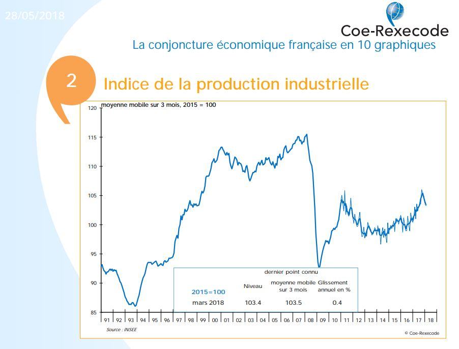 La production industrielle est elle aussi orientée très clairement vers la baisse sans jamais avoir retrouvé, dans notre pays, le niveau de production de l’année 2008 qui fut notre plus haut « historique ».