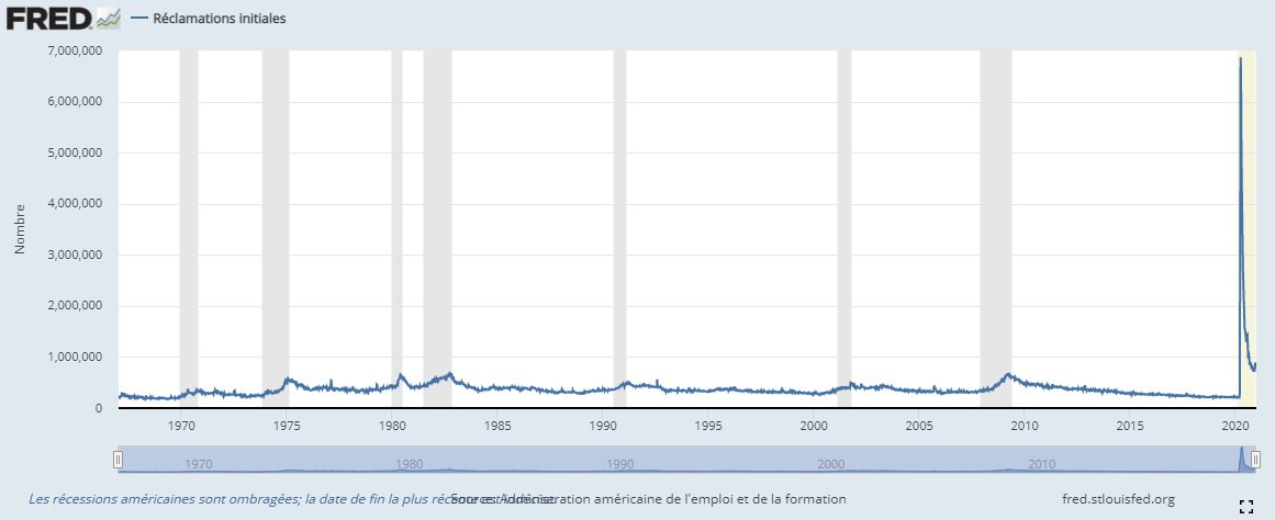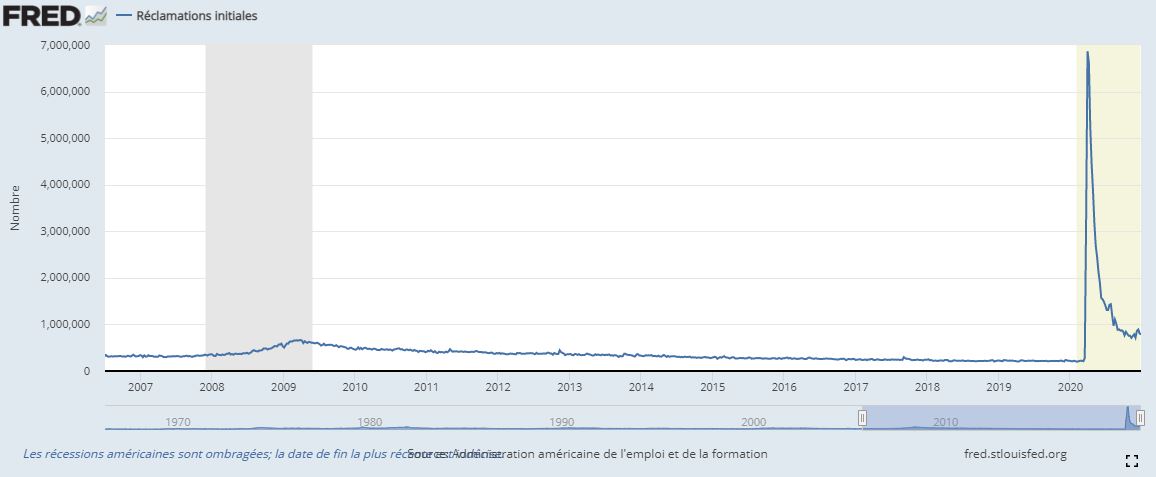 Vous pourrez voir que le point haut est vraiment très haut, et que les points bas des demandes actuelles sont plus élevés que le point haut atteint lors de la crise des subprimes et de la faillite de Lehmann Brothers. Vous pouvez également noter qu’après avoir diminuer le nombre de nouveaux chômeurs chaque semaine se maintient à un niveau structurellement très élevé.