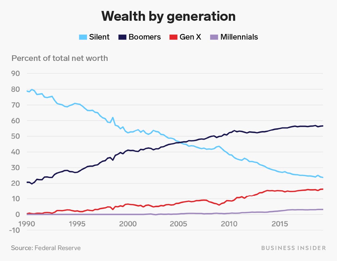 Comme le montre ce graphique identique dans tous les pays du monde… C’est la génération du babyboom qui détient presque tous les sous, les patrimoines et les fortunes !