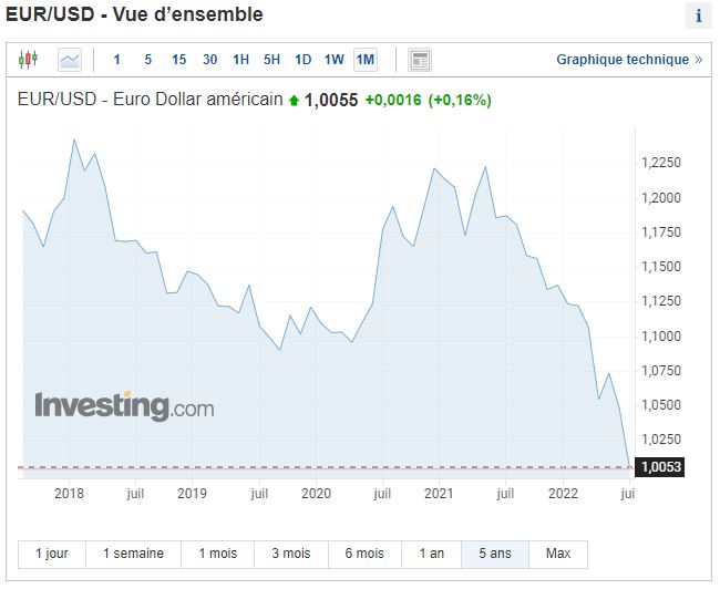 On visualise particulièrement la chute de l’euro sur ce graphique depuis un an.
