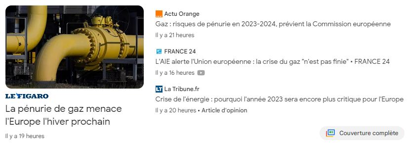 Voici la capture d’écran de Google Actus concernant ces histoires de pénuries de gaz pour 2023 et il semblerait qu’enfin cela s’affole un peu dans les cénacles feutrés de nos hautes de sphères.