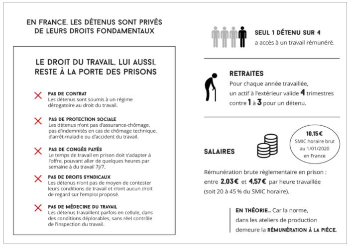 « Ensachage, assemblage, montage, pliage : les activités proposées sont des tâches répétitives, non qualifiantes et sans lien avec le marché de l’emploi. Dépendants des besoins de l’administration pénitentiaire ou mis, par cette dernière, à disposition d’entreprises « concessionnaires », les travailleurs détenus perçoivent 20, 25 %, 45 %, au mieux du SMIC horaire. En théorie, car nombreux sont ceux que ces entreprises continuent de payer à la pièce. Faute de contrat, les détenus travailleurs ne peuvent se prévaloir d’aucun droit ».