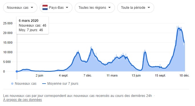 Ce qui est incompréhensible dans la décisions néerlandaise, c’est la courbe de contamination qui est orientée à la baisse ces derniers jours comme vous pouvez le voir sur ce graphique. Le nombre de cas est en chute libre, même si, en même temps, dans ce nombre de cas, celui concernant le variant Omicron est évidemment en hausse ce qui semble paniquer le premier ministre des Pays-Bas qui vient de décider d’un « confinement préventif »… surréaliste !