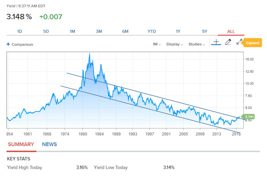 Si les taux baissent depuis 1980 tendanciellement, c’est la première fois depuis 1980 que la tendance de baisse des taux s’inverse pour que graphiquement nous puissions visualiser une tendance de … hausse des taux.