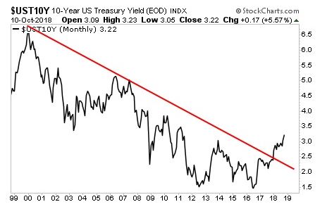 Que le taux phare, le 10 ans américain, vient de casser sa ligne de tendance de long terme et de s’inverser, ce qui signifie que le krach obligataire vient de commencer.