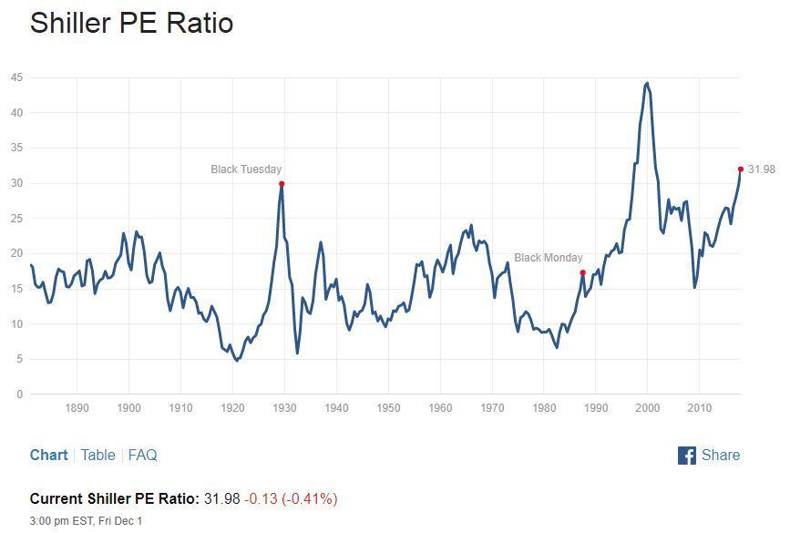 Il a donc développé un indice, le CAPE, pour cyclically adjusted price to earnings, dit aussi PER de Shiller. En gros, cet indice utilise les BPA (Bénéfices nets Par Action) en valeur réelle sur une période de dix ans. Il donne donc une excellente idée du « prix » d’un marché boursier ! Est-ce que les actions sont chères par rapport aux bénéfices qu’elles génèrent ou pas ? Actuellement à plus de 31, cet indice indique sans ambiguïté une surchauffe des marchés.