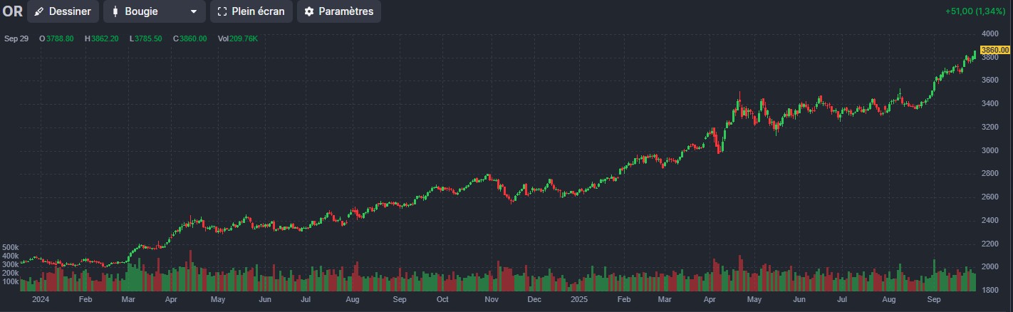 A 3 860$ l’once en fin de journée du 29 septembre 2025, l’or est en hausse sur un an de 25 % en € et de 45 % en dollar ce qui est évidemment une performance considérable.