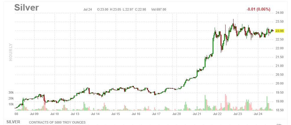 Si vous regardez maintenant le graphique ci-dessous qui est celui de l’évolution des cours de l’argent, vous voyez que la hausse ne monte plus !!