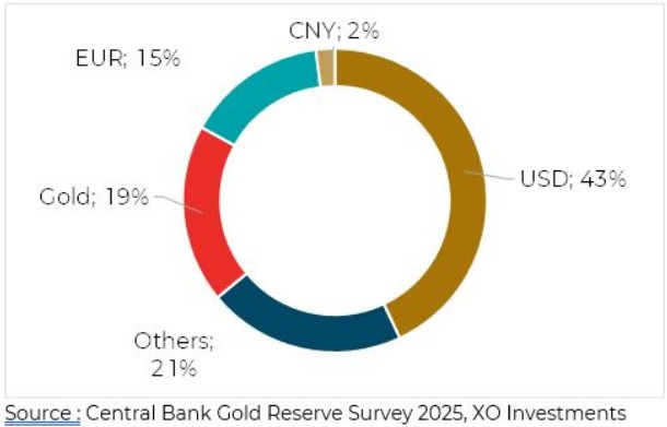 Les banques centrales détiennent 43 % de dollars et 19 % d’or.