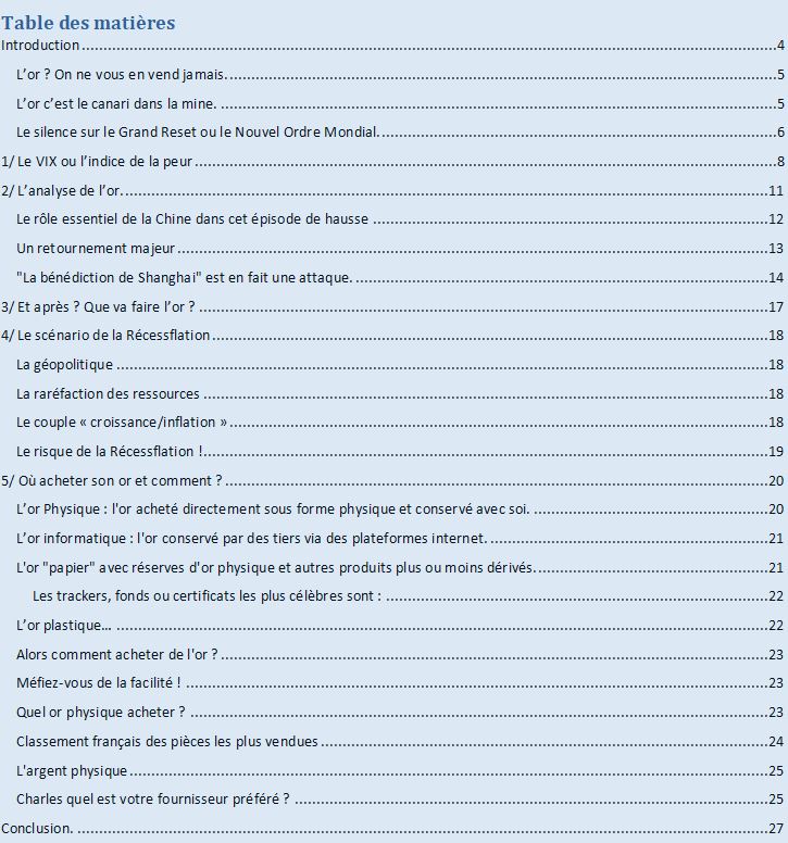 Je vous en mets ici copie de la table des matières pour vous permettre de visualiser ce qui est traité dans ce dossier de 30 pages spécialement consacré au métal jaune.