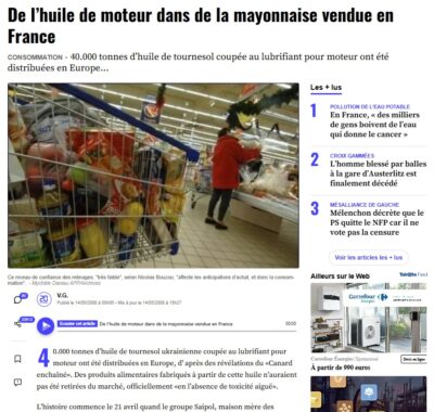 « 40.000 tonnes d’huile de tournesol ukrainienne coupée au lubrifiant pour moteur ont été distribuées en Europe, d’ après des révélations du «Canard enchaîné». Des produits alimentaires fabriqués à partir de cette huile n’auraient pas été retirées du marché, officiellement «en l’absence de toxicité aiguë».