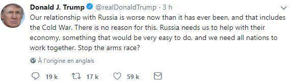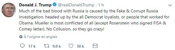 Pour aller plus loin, après son tweet totalement militaire et stratégiquement débile, Trump en a écrit un autre où il accuse le FBI et les clintoniens/obamistes de rendre les relations avec la Russie saignantes… Et c’est dans ce message nettement plus important que se cache le véritable message adressé à Poutine par Trump. D’ailleurs, vous remarquerez que ces deux derniers tweets ont été nettement moins repris et diffusés que le premier très belliciste. Nul doute qu’ils aient été transmis à Vladimir Poutine.