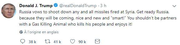 Alors que fait Trump ? Non, il n’est pas stupide. Il prévient la Russie qu’il va être obligé de frapper la Syrie pour la forme et qu’il souhaiterait bien que cela en reste là… Macronléon 1er aussi ne semble pas pressé de se lancer sur le sentier de la guerre… Et je ne serais pas étonné si nos Rafale restaient à quai, ce qui serait évidemment la chose la plus intelligente à faire (et paradoxalement la plus courageuse).