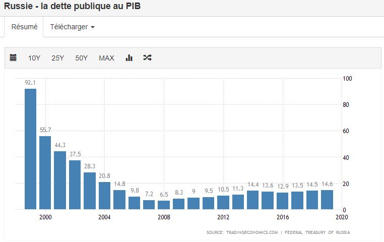 Le ratio dette sur PIB de la Russie est inférieur à 20 % ce qui en fait l’un des pays les mieux gérés de la planète, loin, très loin devant la France ou même les Etats-Unis.