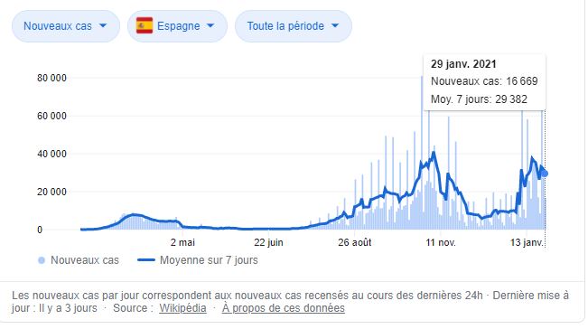 Mieux, si nous regardons la courbe des cas en Espagne qui n’a pas confiné une seconde fois parce que l’Espagne vient de dire qu’elle n’avait pas les moyens de confiner, elle laisse passer l’épidémie, restaurants ouverts…