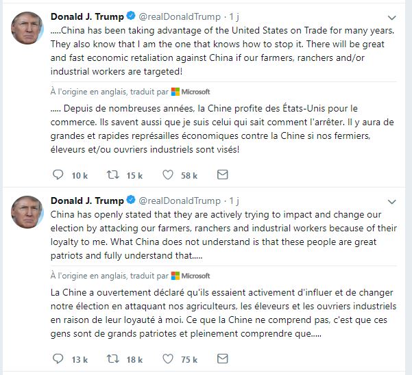 Comme le dit l’AFP, « le ton est encore monté d’un cran entre Washington et Pékin : Donald Trump a accusé mardi la Chine d’essayer d’influencer les élections américaines en ciblant sa base électorale dans la guerre commerciale en cours.
