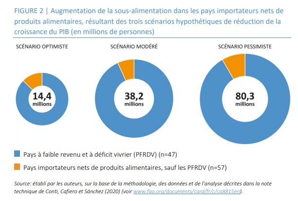« Résultats. En passant des hypothèses les plus optimistes aux moins optimistes de réduction de la croissance du PIB (2 p.p., 5 p.p. et 10 p.p. de réduction de la croissance du PIB), entre 14,4 millions et 80,3 millions de personnes environ pourraient souffrir de sous-alimentation dans les pays importateurs nets de produits alimentaires, si l’on compare avec les estimations disponibles de la prévalence de la sous-alimentation (Figure 2).