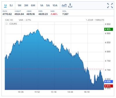 Elle se termine en baisse de 1.46 %. Autant dire que la baisse est ancrée, même si elle n’est pas aussi forte que la chute de la veille comme vous pouvez le voir sur ce graphique qui retrace la séance d’hier. A noter également que depuis le 1er janvier 2020 le CAC40 est en baisse de 21 % et quelques.