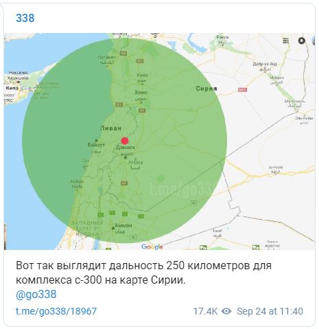 Voici à quoi ressemble la portée de 250 kilomètres du complexe S-300 sur une carte de la Syrie.