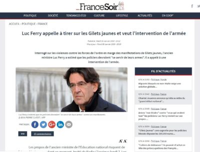 On peut aussi comme le demande Luc Ferry faire directement tirer sur la foule de Gilets Jaunes à balles réelles et tuer femmes et hommes.  Comme le montre cet article de France Soir (cliquez dessus pour le croire…)