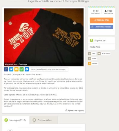 En quelques heures, la barre des 100 000 euros collectés a été franchie allègrement. Les dons affluent par milliers, ainsi que les commentaires. Je vous invite à aller les lire. Peu importe ce que vous pensez, ce que vous croyez moral ou pas. Si nous analysons froidement les choses et ce que nous révèle la réalité, c’est que, au moment où j’écris ces lignes, 8 000 personnes viennent de donner de l’argent à Christophe Dettinger, 2 500 ont écrit un mot de soutien sans cacher leur identité. En fait, vous ne pourrez plus les lire, car Leetchi a fermé la cagnotte.