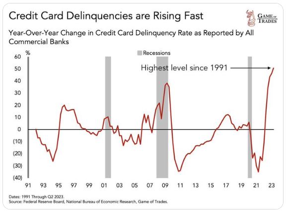 Ce n’est probablement que le début des difficultés que les consommateurs ressentiront en raison des taux d’intérêt plus élevés qu’il faut désormais payer sur tous les différents types d’emprunt. C’est une conséquence parfaitement prévisible de la hausse des taux menée par la FED.