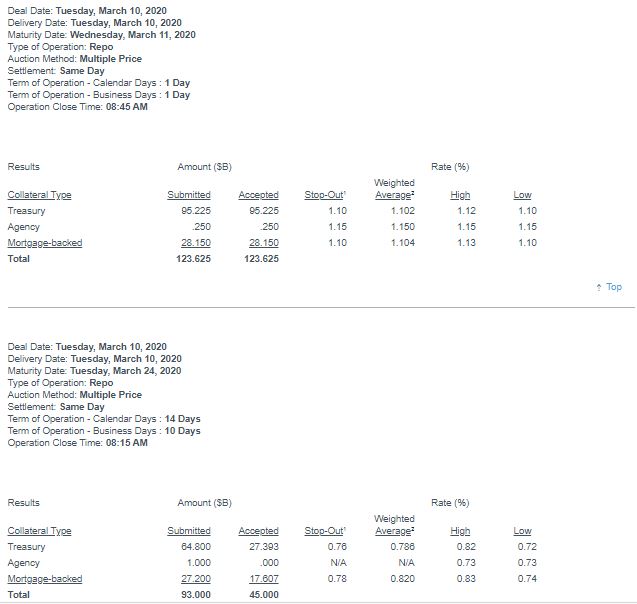Si l’on regarde le tableau des opérations de REPO pour le 10 mars 2020 nous sommes à plus de 167 milliards de dollars.