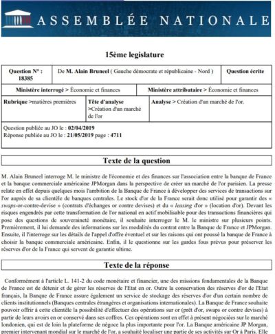 On va donc tenter de se rassurer avec cette phrase « ce type d’opérations concerne les opérations sur or de la clientèle institutionnelle et ne mettent pas en jeu les propres avoirs en or de la Banque de France, pas même à titre de garantie. Compte tenu de la parfaite ségrégation des avoirs or de la clientèle et de la Banque de France, il n’est ainsi pas possible qu’une erreur ou une mauvaise opération affecte le stock d’or de la France » en se disant que dans l’esprit le ministre a bien voulu dire qu’il n’y aurait pas ce type d’opération de swap ou de prêts sur les réserves d’or de la Banque de France.