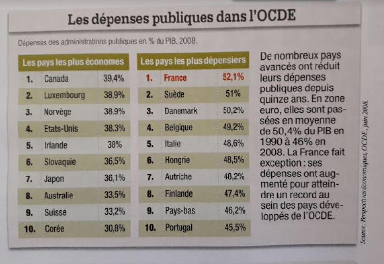 Celui ci-dessous donne le niveau des dépenses publiques en pourcentage du PIB. En France nous sommes à presque 60% désormais. Pourtant nous vivons moins bien aujourd’hui qu’il y a 10 ans. La question qui dérange? Ou passe l’argent?