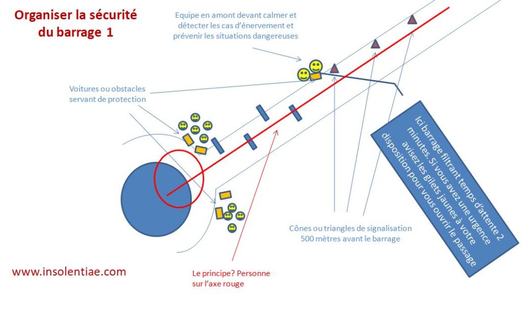 En amont, et juste avant les chicanes et après les triangles de signalisation, annoncez le fonctionnement de votre barrage sur une banderole ! « Ici barrage filtrant, temps d’attente de 2 minutes et vous pourrez passer. Ici barrage symbolique »… Ce simple mot en amont va « détendre » l’automobiliste fragile du ciboulot !