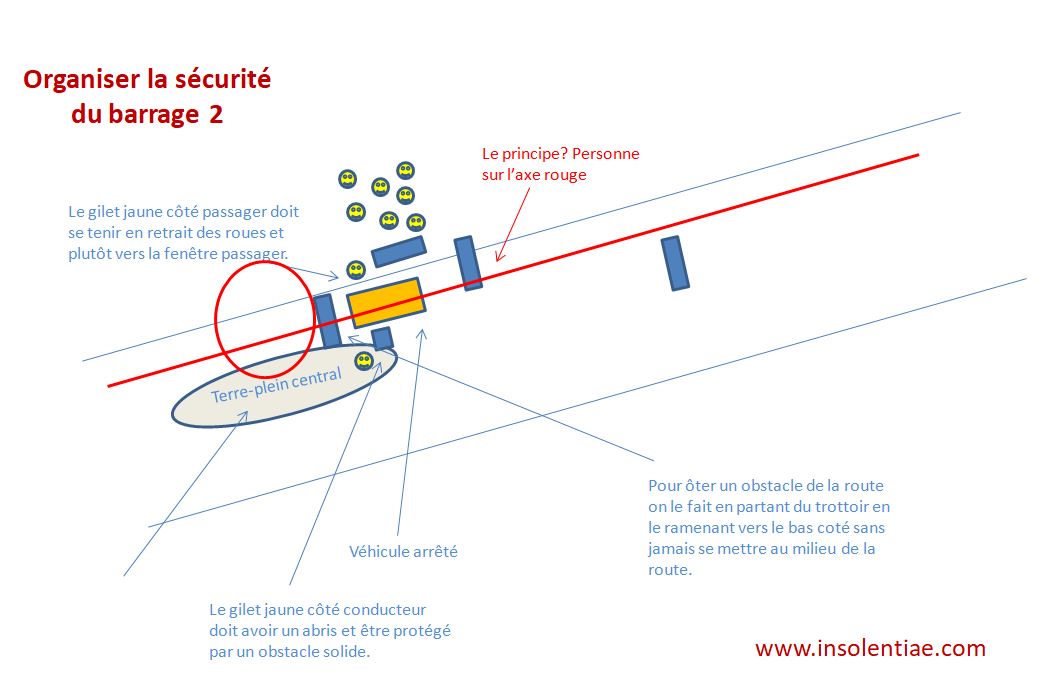 Les piétons gilets jaunes ne doivent pas se trouver sur la trajectoire des véhicules. Ce principe doit être répété à tous régulièrement et à tous les nouveaux venus sur un point de blocage. Imprimez les consignes et faites-les lire à tous.