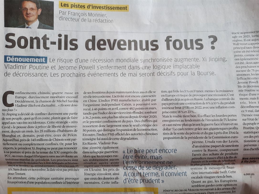 François Monnier le directeur de la rédaction du journal Investir n’est pas franchement ni un complotiste ni un grand révolutionnaire à la solde des forces communistes et au service de la CGT alors quand il nous gratifie d’un édito hebdomadaire intitulés « Sont-ils tous devenus fous ? », cela me donne envie de lire sa prose.