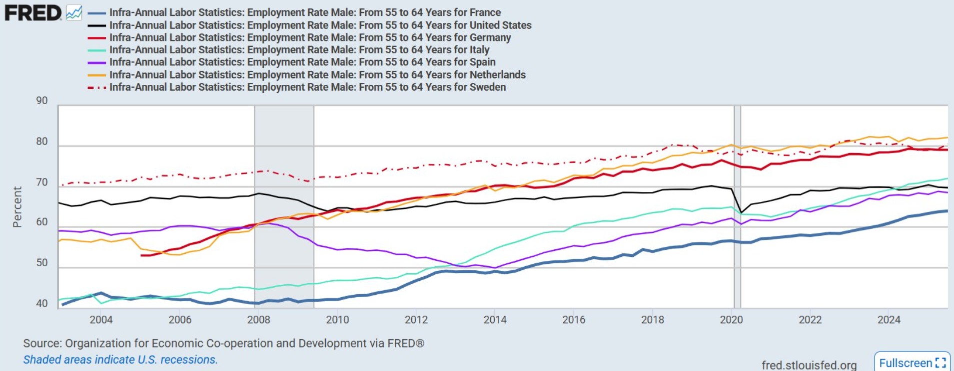 Vous remarquerez le taux très élevé donc de « séniors » au boulot au Pays-Bas ou en Allemagne alors que notre pays la France est le pays où le taux de participation est le plus faible.