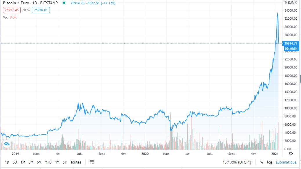 « cette chute vertigineuse du Bitcoin qui est à la hauteur de sa dernière flambée » : il va falloir acheter des lunettes Charles 🙂 on est sur un simple correction avec un seuil très stable à 25000€…. qui est le cours déjà très haut atteint début janvier ! vous avez du oublier qu’il était à 7500€ il y a tout juste un an… mais comme l’or, ne serait pas parce que l’euro et le dollar dans lesquels le BTC s’exprime ne valent plus rien à force d’en « inventer à partir de rien ? »