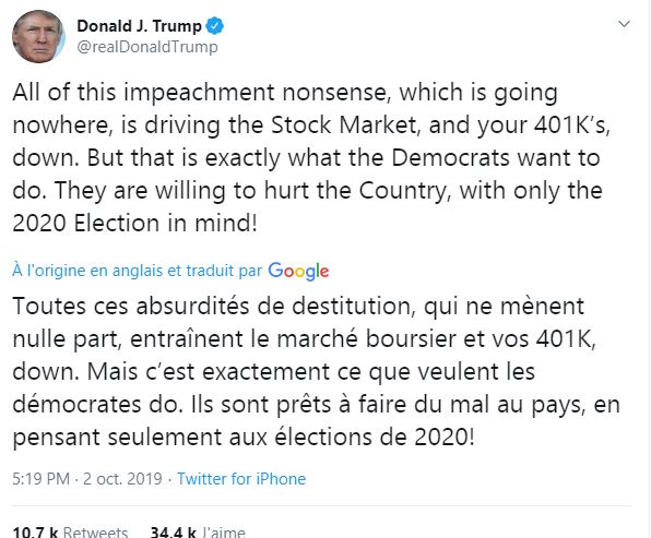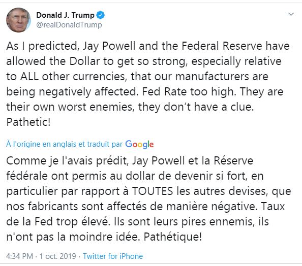 Le Président Trump dans deux de ces derniers tweets est en train de vous prévenir de la prochaine crise que selon lui les démocrates et la FED ont décidé de déclencher. Vous êtes, nous ne sommes que des idiots utiles parfaitement sacrifiables sur l’autel des objectifs de nos puissants, et certains puissants ont désormais intérêt à déclencher une crise à quelques mois de l’élection présidentielle sur fond de procédure « d’impeachment » vaseuse pour montrer l’incompétence de Trump et éviter sa réélection. Ces puissants, sont au sens large, ceux que nous appellerons les Mondialistes.