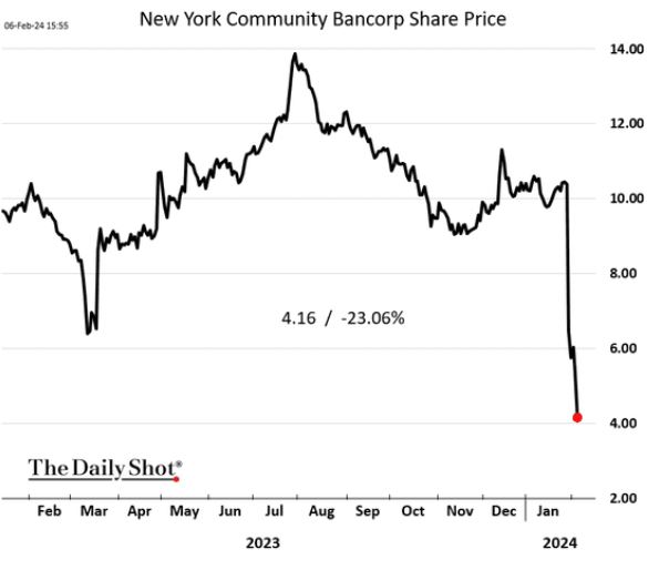 Or, depuis quelques semaines, de nouveaux craquements se font entendre sur le front des petites banques régionales américaines comme en témoigne l’effondrement du cours de bourse de la New York Community Bank, en baisse de 63 % en 1 mois ! L’indice des banques régionales quant à lui est en baisse de 13 % depuis le début de l’année.