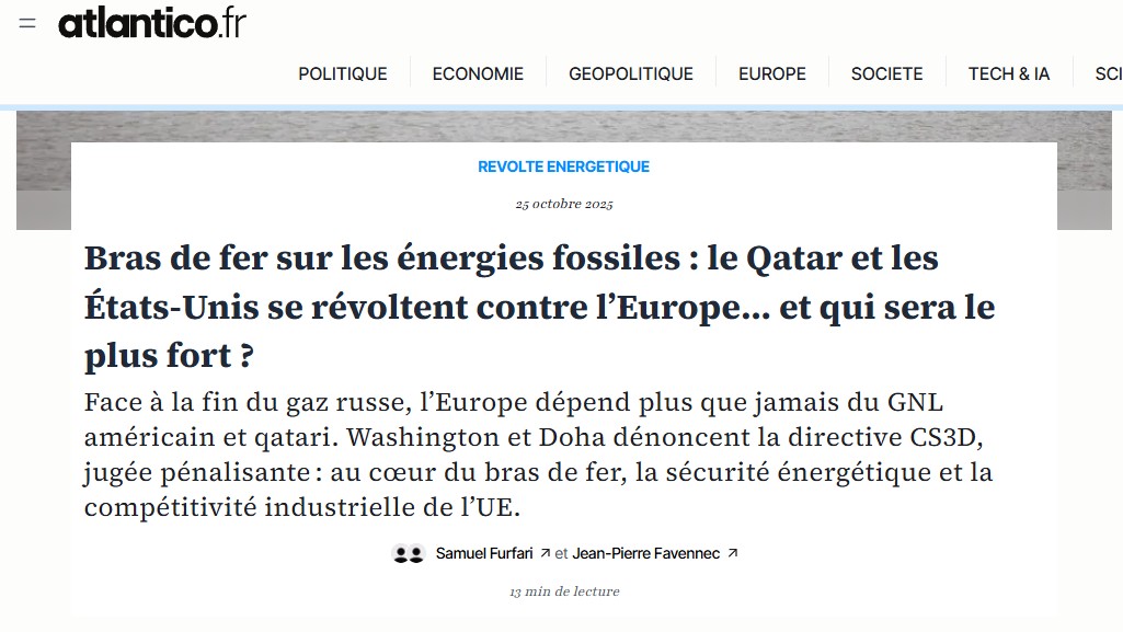 « Si l’Europe ne revoit pas le CSDDD ou ne l’assouplit pas, avec une pénalité de 5 % de notre chiffre d’affaires mondial, nous ne livrerons pas de GNL à l’Europe, c’est certain », a déclaré le ministre qatari Saad Al-Kaabi.